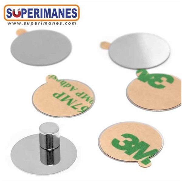 Este producto es un set de 10 discos de acero inoxidable muy finos y pequeños con una cara adhesiva para pegarlos un una superficie y usarlos como contrapieza de imanes. Este producto no es magnético ni es un imán. Discos tamaño 15mm x 0,4mm de espesor. Base metálica de acero con adhesivo en el dorso para poder pegar imanes.