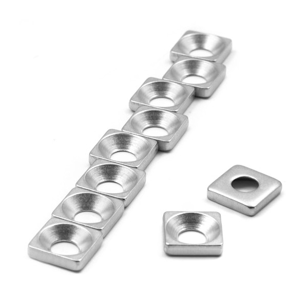 Base metálica cuadrada de acero para atornillar, con longitud 12 mm, ancho 12 mm y alto 3 mm. Incorpora taladro avellanado con diámetro exterior de 11,7 mm y diámetro interior de 5,7 mm para tornillos de cabeza avellanada. Revestimiento en níquel. Peso aproximado 2 gramos.
