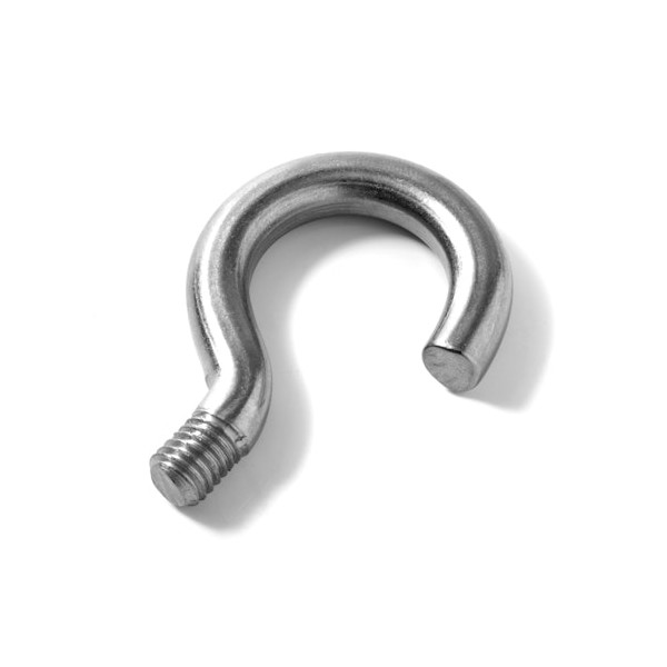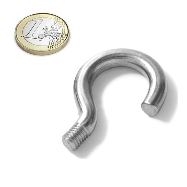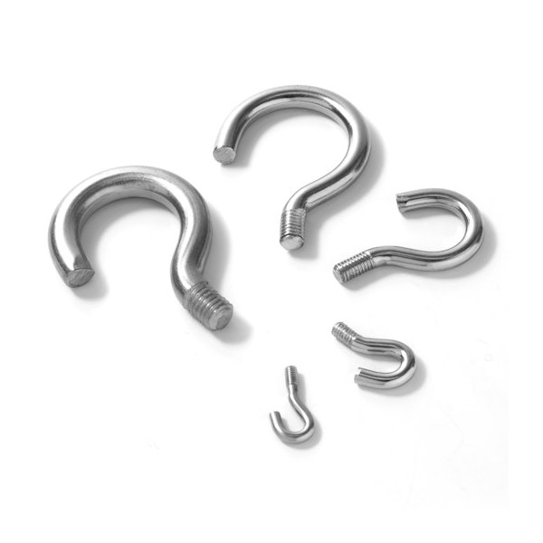 Pequeños ganchos redondos con altura 53,5 mm y abertura del gancho 17 mm y rosca métrica 8 y con diámetro interior de 22 mm. Peso 34 g/uds.