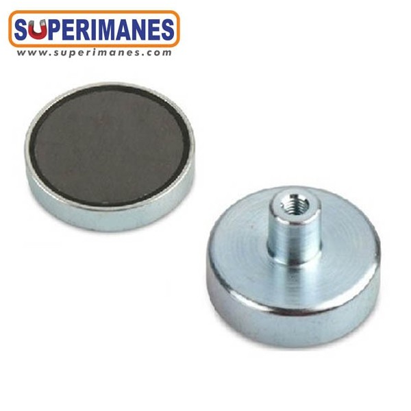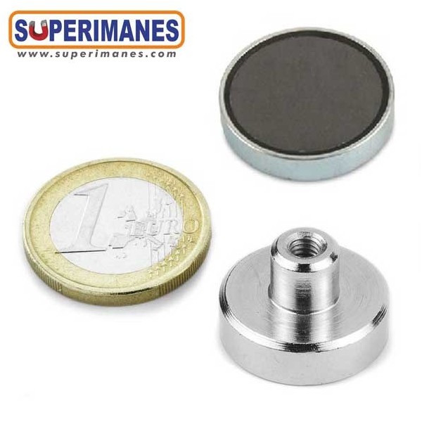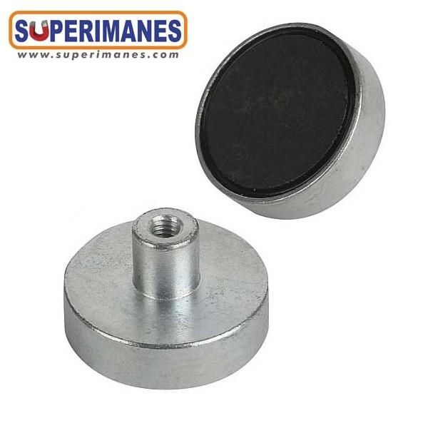 Los imanes en recipiente con casquillo roscado llevan en una cara un casquillo donde puede enroscar ganchos, hembrillas, tornillería, etc.