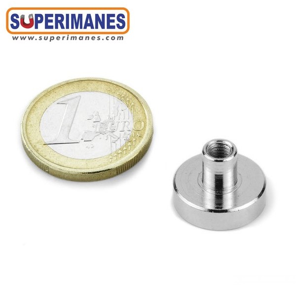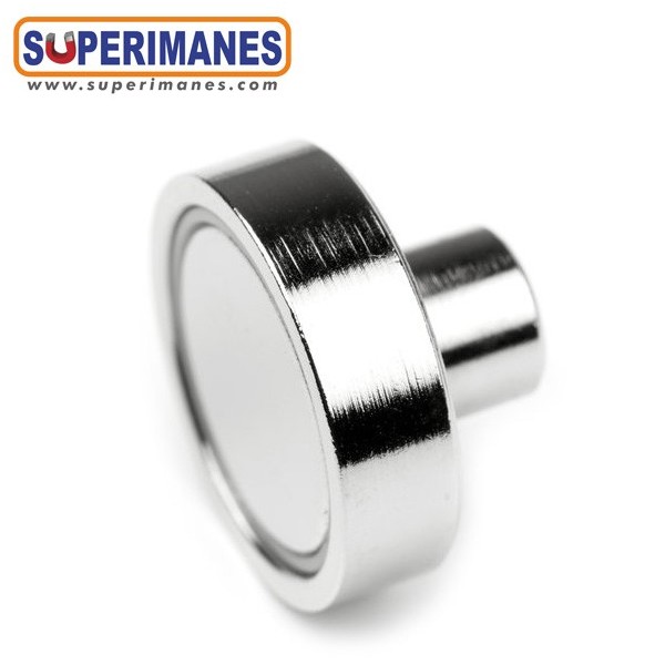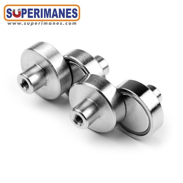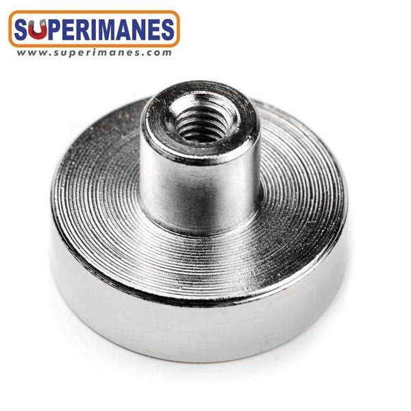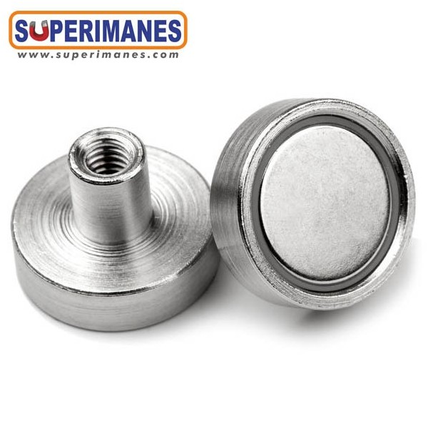 Los imanes en recipiente con casquillo roscado llevan en una cara un casquillo donde puede enroscar ganchos, hembrillas, tornillería, etc.