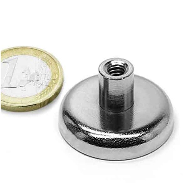 Imán de neodimio insertado en un recipiente de acero con casquillo roscado hembra, métrica 6. Diámetro 32 mm y altura de recipiente 8 mm siendo la altura total con el casquillo 16,5 mm. Bloque magnético con fuerza de sujeción de 30 kg. aproximadamente. Magnetizado en N35 axial. Con revestimiento de níquel. Temperatura máxima de servicio de 80º C. La pieza tiene un peso de 44 gramos.