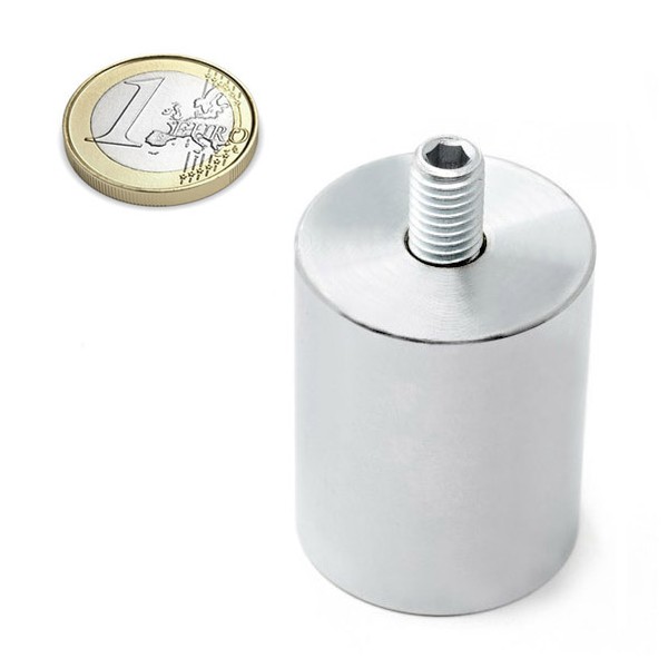Imán de neodimio en forma de cilindro con vástago roscado. Esta base magnética cilíndrica tiene un diámetro de 32 mm y una altura total de 52 mm incluido el vástago. Vástago rosca macho M8. Cilindro de acero con interior magnético de neodimio y revestimiento niquelado. Base magnética con una fuerza de sujeción de aproximadamente 34 kg. Magnetización N42 axial, con la cara visible del imán siendo el polo norte. Temperatura máxima de servicio 80 °C. Peso de la pieza 240 gramos.
