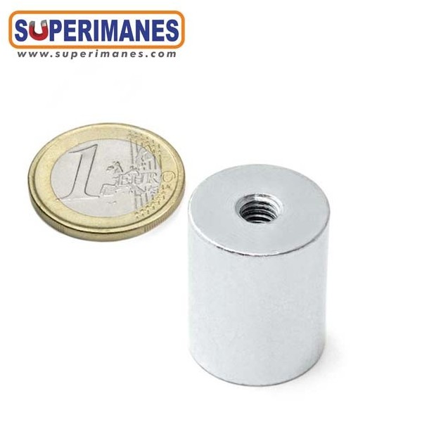 Imán de neodimio en forma de cilindro con rosca interior. Esta base magnética cilíndrica tiene un diámetro de 20 mm y altura total de 25 mm. Lleva una rosca interior hembra M6. Cilindro de acero e interior magnético de neodimio. Base magnética con fuerza de sujeción de 13 kg. aproximadamente. Temperatura máxima de servicio de 80º C. La pieza tiene un peso de 58 gramos.