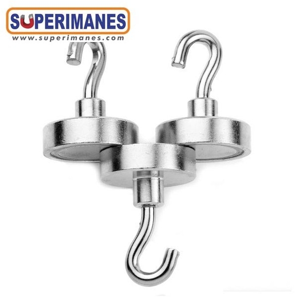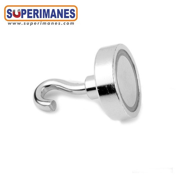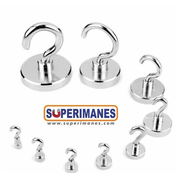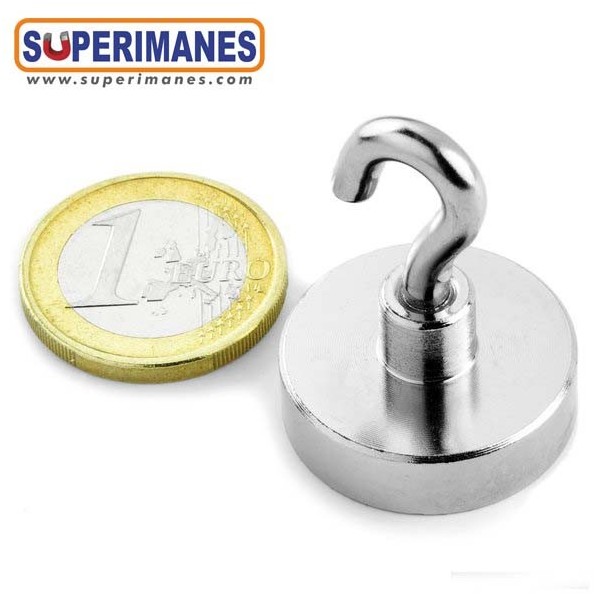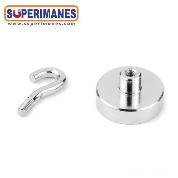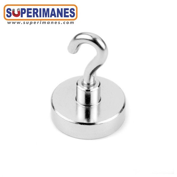 Estos imanes con ganchos son niquelados. Tienen un diámetro de 25 mm. Fuerza sujeción 18 kilos aproximadamente. El gancho se puede desenroscar completamente, con métrica 4. Ideal para colgar objetos. Son de neodimio y tienen un recubrimiento en níquel. Magnetización N38. Tiene un peso de 30 gramos.