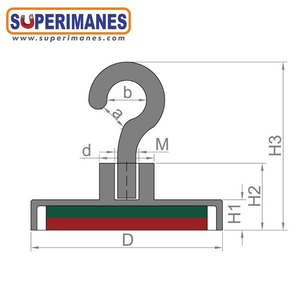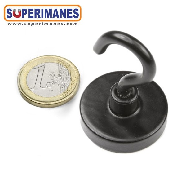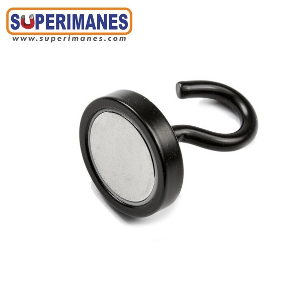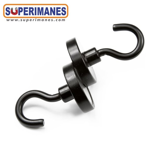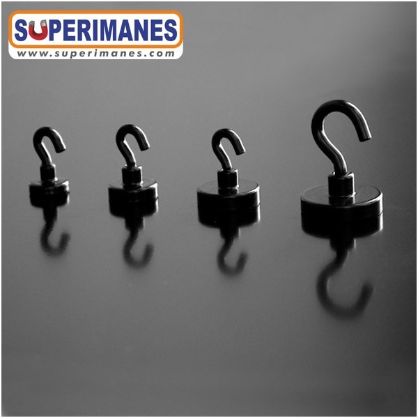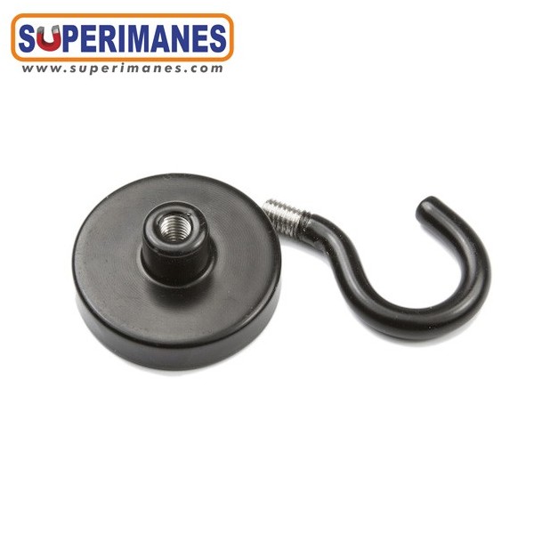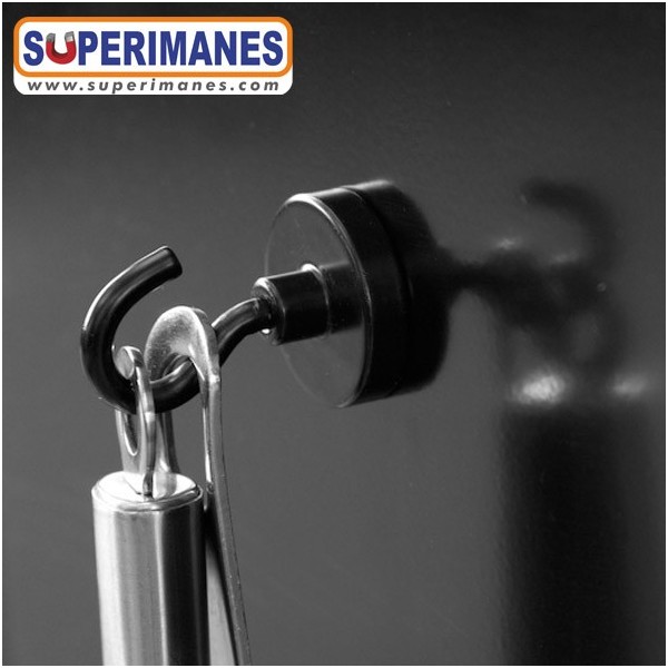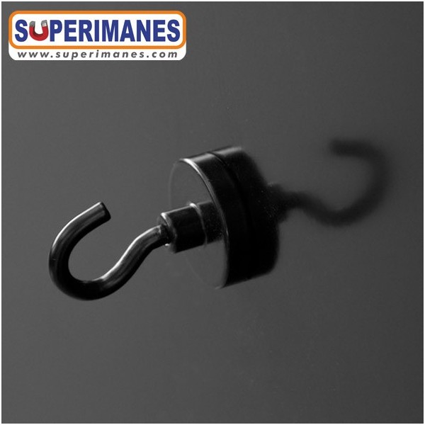 Estos imanes con ganchos son de color negros. Tienen un diámetro de 32,3 mm y un largo total con el gancho de 45,3 mm. Fuerza sujeción 28 kilos aproximadamente. El gancho se puede desenroscar completamente. Ideal para colgar objetos. Son de neodimio y tienen un recubrimiento de polvo negro. Magnetización axial. Tiene un peso de 53 gramos.