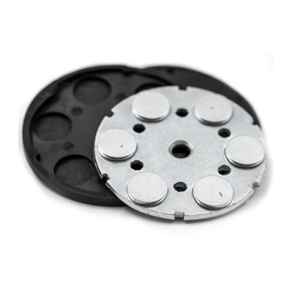 Está compuesto por un conjunto de 6 imanes de neodimio dispuestos de forma alterna norte/sur en su base, encapsulados en un recipiente de acero y recubiertos con goma negra. Dispone de un taladro avellanado que permite su fijación mediante tornillos avellanados a superficies no metálicas. El recubrimiento de goma protege las superficies de posibles arañazos y proporciona resistencia al deslizamiento.