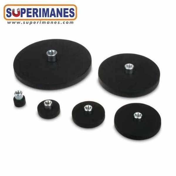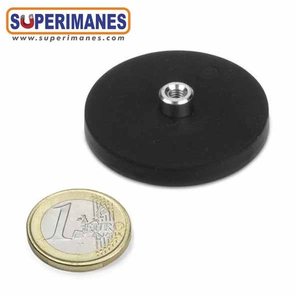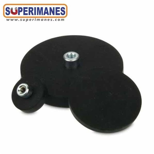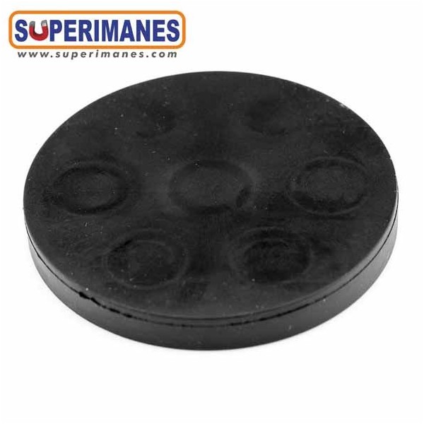 Este imán está compuesto por un sistema de 6 imanes colocados alternos norte/sur en su base con un revestimiento de goma en el exterior. Medida diámetro de 43 mm x 6 mm de altura y altura total incluyendo casquillo 10,5 mm. Tiene un casquillo roscado de diámetro 8 y métrica M4 para poder fijar a objetos que tengan rosca exterior. El recubrimiento de goma de esta base magnetica sirve para proteger las zonas de arañazos y para su impermeabilidad. Imán en recipiente con fuerza de sujeción de 8,5 kg. aproximadamente. Magnetizado en N35 axial. Temperatura máxima de servicio de 60º C. La pieza tiene un peso de 60 gramos.