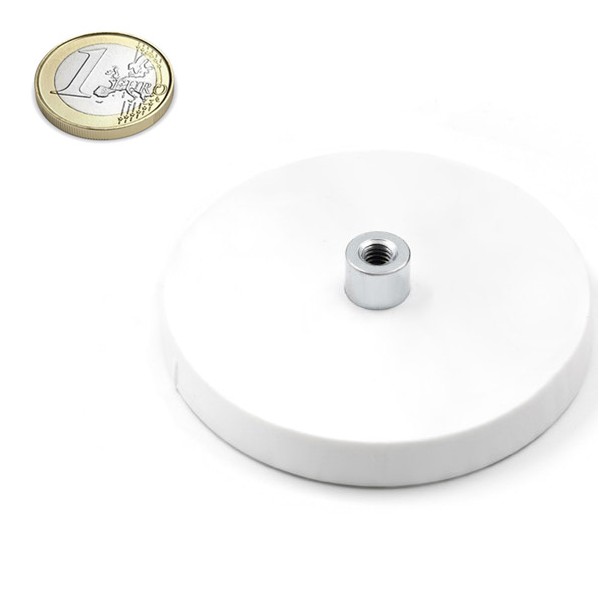 Estas bases magnéticas llevan un revestimiento de goma en el exterior blanca, medida diámetro de 66 mm x 8,5 mm de alto y un alto total de 15 mm incluyendo el casquillo roscado. Con rosca de métrica M5 para poder fijar a objetos que tengan rosca exterior. El casquillo roscado tiene un diámetro del cuello de 10 mm. El recubrimiento de goma de esta base magnética sirve para proteger las zonas de arañazos y para su impermeabilidad. Imán en recipiente con fuerza de sujeción de 25 kg. aproximadamente. Magnetizado en N38. Temperatura máxima de servicio de 80º C. La pieza tiene un peso de 110 gramos.