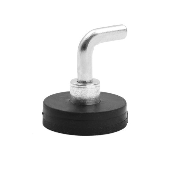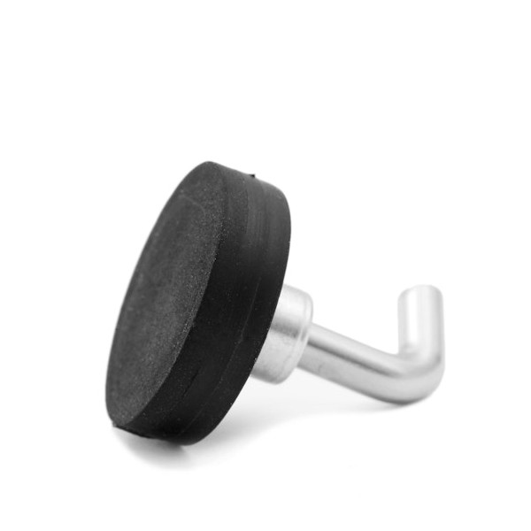 Estos imanes con ganchos en forma de L tienen su base revestida con goma-caucho negro. La base magnética tiene un diámetro de 22 mm y un largo total con el gancho de 25,5 mm. Sistema magnético con métrica 4. Fuerza sujeción 5,9 kilos (57,9 N), pero su fuerza sujeción en pared es hasta 1,8 kg aproximadamente. El gancho se puede desenroscar completamente. Ideal para colgar objetos. Sistema magnético de neodimio y el imán tiene recubrimiento engomado. Magnetización N38. Tiene un peso de 15,40 gramos.