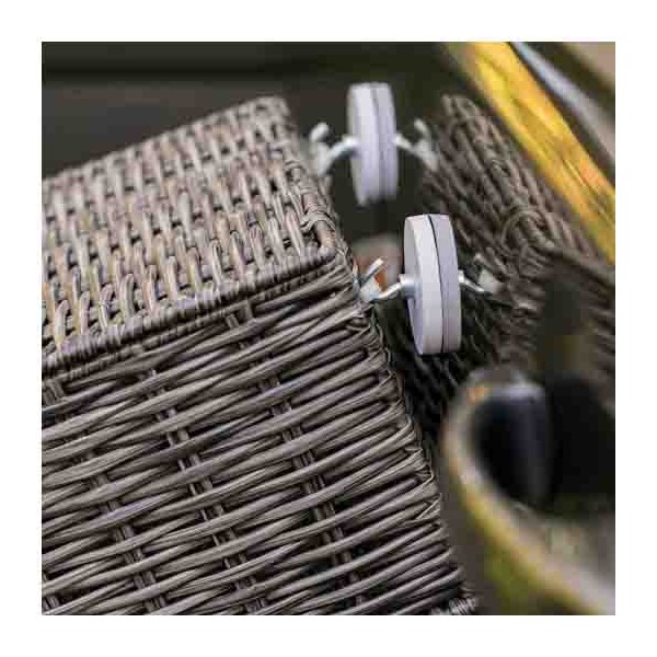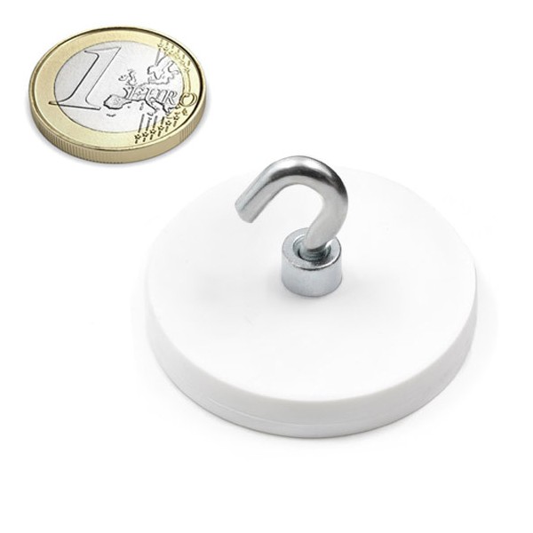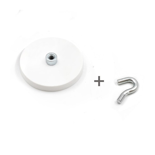 Estos imanes con ganchos están revestidos con goma-caucho blanca. La base magnética tiene un diámetro de 43 mm y un largo total con el gancho de 24,5 mm. Sistema magnético con métrica 4. Fuerza sujeción 10 kilos (98,1 N) aproximadamente. El gancho se puede desenroscar completamente. Ideal para colgar objetos. Son de neodimio y el imán tiene recubrimiento engomado. Su base es un sistema magnético integrado por varios imanes en una sola pieza. Magnetización N42. Tiene un peso de 33 gramos.