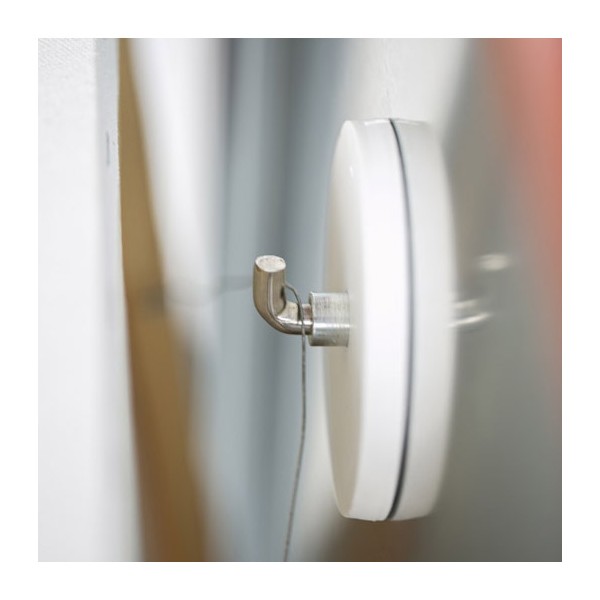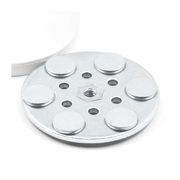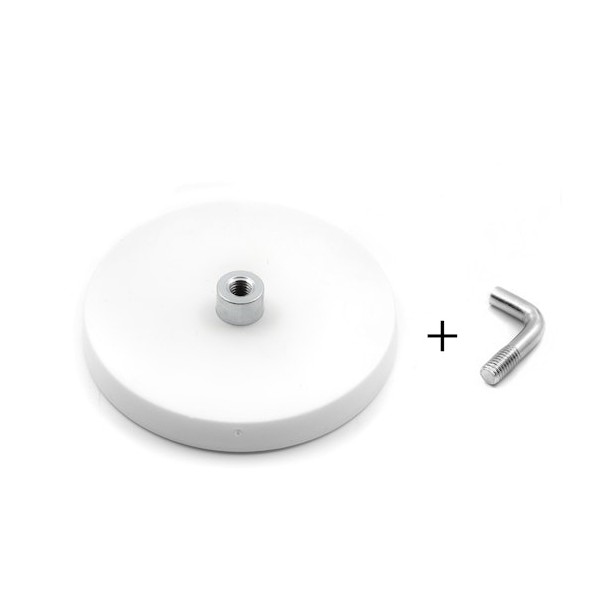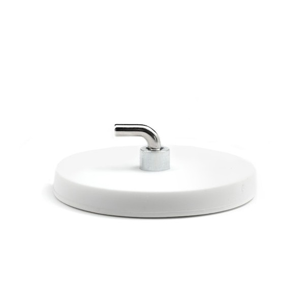 Estos imanes con ganchos en forma de L tienen la base revestida con goma-caucho blanco. La base magnética tiene un diámetro de 66 mm y un largo total con el gancho de 30 mm. Sistema magnético con métrica 5. Fuerza sujeción 25 kilos (245 N) aproximadamente. El gancho se puede desenroscar completamente. Ideal para colgar objetos. Son de neodimio y el imán tiene recubrimiento engomado. Su base es un sistema magnético integrado por varios imanes en una sola pieza. Magnetización N38. Tiene un peso de 109 gramos.