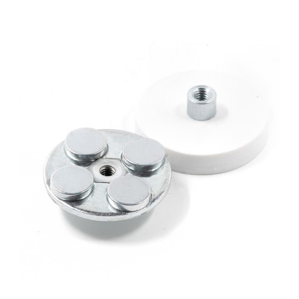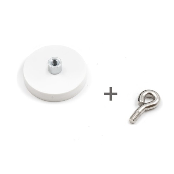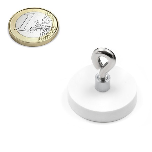 Estos imanes con hembrilla están revestidos con goma-caucho blanco. La base magnética tiene un diámetro de 31 mm y un largo total con el gancho de 25,5 mm. Sistema magnético con métrica 4. Fuerza sujeción 9 kilos (88,3 N) aproximadamente. El gancho se puede desenroscar completamente. Ideal para colgar objetos. Son de neodimio y el imán tiene recubrimiento engomado. Magnetización N42. Tiene un peso de 25 gramos.