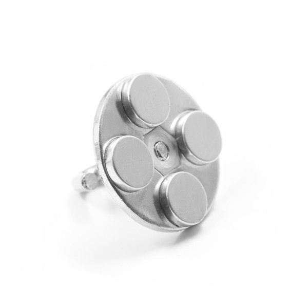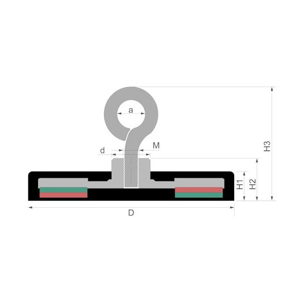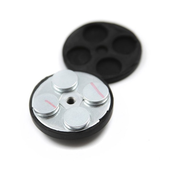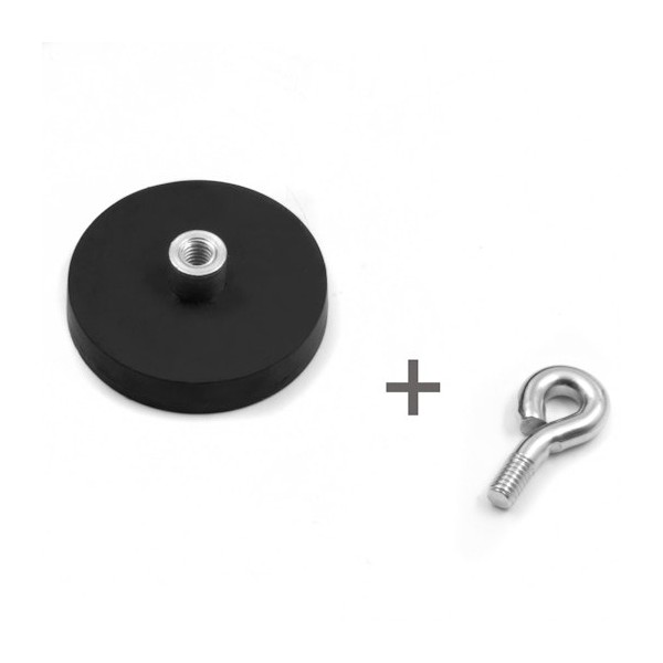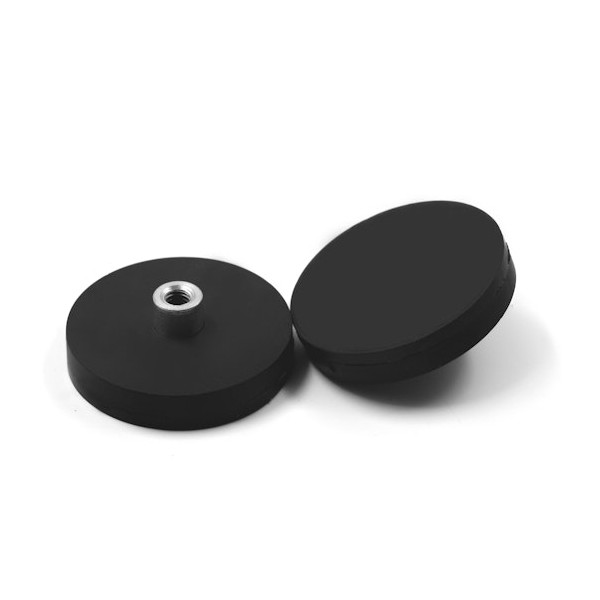 Estos imanes con hembrilla están revestidos con goma-caucho negro. La base magnética tiene un diámetro de 31 mm y un largo total con el gancho de 25,5 mm. Sistema magnético con métrica 4. Fuerza sujeción 9 kilos (88,3 N) aproximadamente. El gancho se puede desenroscar completamente. Ideal para colgar objetos. Son de neodimio y el imán tiene recubrimiento engomado. Magnetización N42. Tiene un peso de 25 gramos.