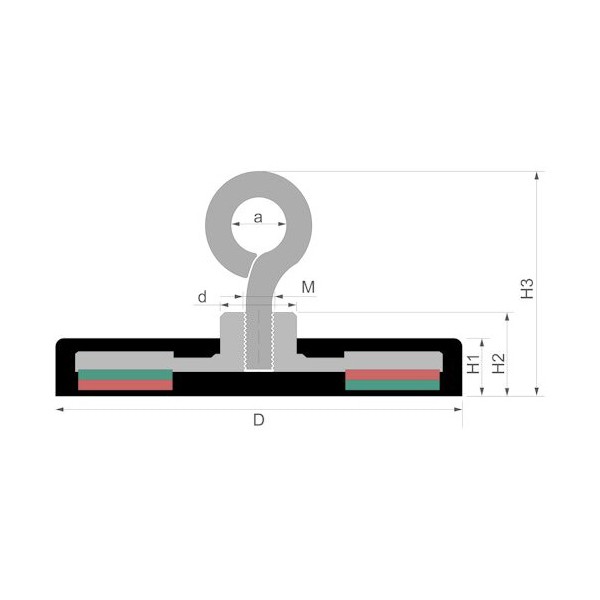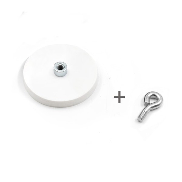 Estos imanes con hembrilla están revestidos con goma-caucho negro. La base magnética tiene un diámetro de 43 mm y un largo total con el gancho de 24 mm. Sistema magnético con métrica 4. Fuerza sujeción 10 kilos (98,1 N) aproximadamente. El gancho se puede desenroscar completamente. Ideal para colgar objetos. Son de neodimio y el imán tiene recubrimiento engomado. Magnetización N42. Tiene un peso de 33 gramos.