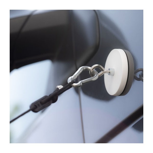 Estos imanes con hembrilla están revestidos con goma-caucho blanco. La base magnética tiene un diámetro de 66 mm y un largo total con el gancho de 43,5 mm. Sistema magnético con métrica 5. Fuerza sujeción 25 kilos (245 N) aproximadamente. El gancho se puede desenroscar completamente. Ideal para colgar objetos. Son de neodimio y el imán tiene recubrimiento engomado. Magnetización N38 Tiene un peso de 110 gramos.