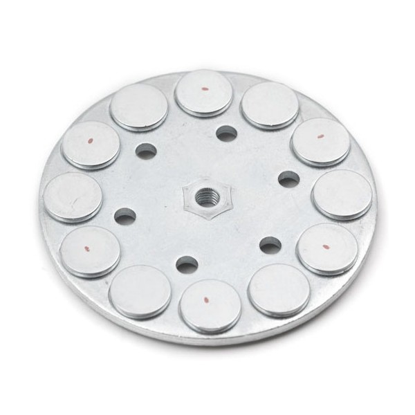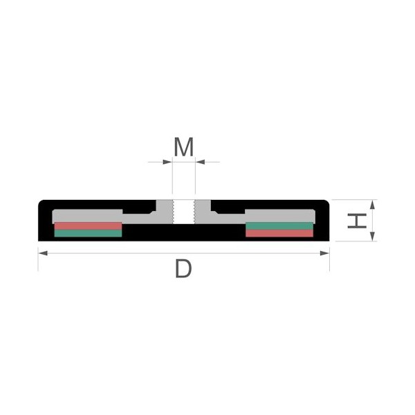 Este tipo de imán está compuesto por un conjunto de 12 imanes colocados alternos norte/sur en su base, este imán lleva un revestimiento de goma en el exterior. Estos imanes en recipiente con rosca interior llevan en una rosca con métrica M6 para poder fijar a objetos que tengan rosca exterior. El recubrimiento de goma de esta base magnética sirve para proteger las zonas de arañazos y para su impermeabilidad. Tiene una medida de 88 mm de diámetro por 8,5 mm de alto. Base magnética con fuerza de sujeción de 56 kg. aproximadamente. Magnetizado en N38 axial. Con revestimiento de goma. Temperatura máxima de servicio de 80º C. La pieza tiene un peso de 190 gramos.