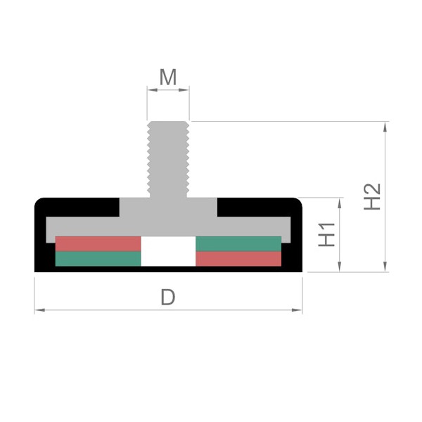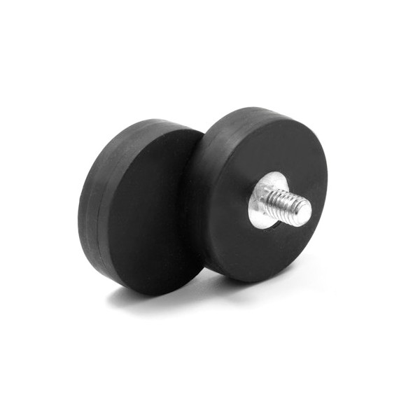 Estas bases magnéticas llevan un revestimiento de goma en el exterior, medida diámetro de 22 mm x 6 mm de altura y con vástago altura total 12,5 mm. Tiene un vástago roscado de métrica M4 para poder fijar a objetos que tengan rosca exterior. El recubrimiento de goma de esta base magnética sirve para proteger las zonas de arañazos y para su impermeabilidad. Imán en recipiente con fuerza de sujeción de 5,9 kg. aproximadamente. Magnetizado en N42 axial. Temperatura máxima de servicio de 80º C. La pieza tiene un peso de 10 gramos.