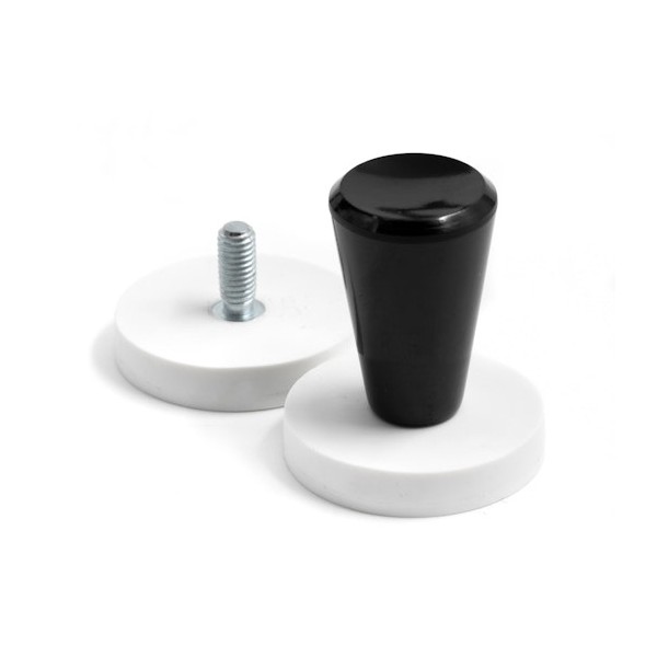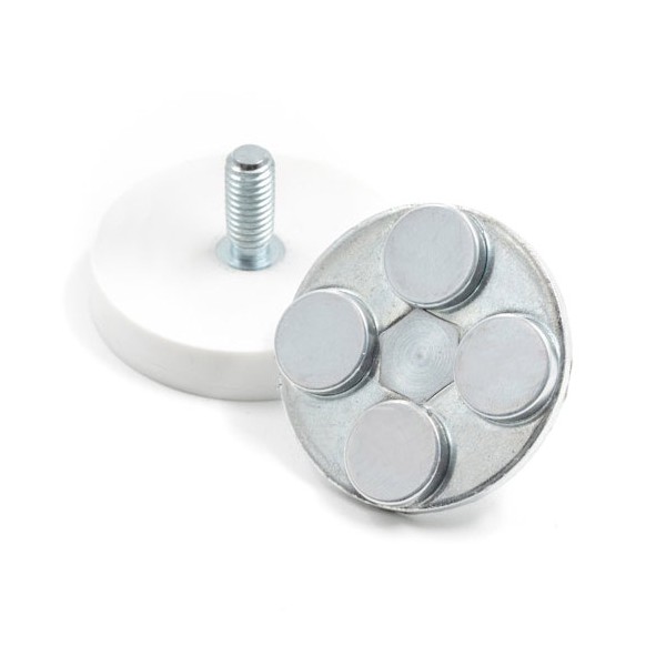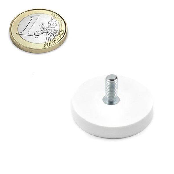 Estas bases magnéticas llevan un revestimiento de goma blanca en el exterior, medida diámetro de 31 mm x 6 mm de altura y con vástago altura 18mm. Tiene un vástago roscado de métrica M5 para poder fijar a objetos que tengan rosca exterior. El recubrimiento de goma de esta base magnética sirve para proteger las zonas de arañazos y para su impermeabilidad. Imán en recipiente con fuerza de sujeción de 8 kg. aproximadamente. Magnetizado en N42. Temperatura máxima de servicio de 80º C. La pieza tiene un peso de 21 gramos.
