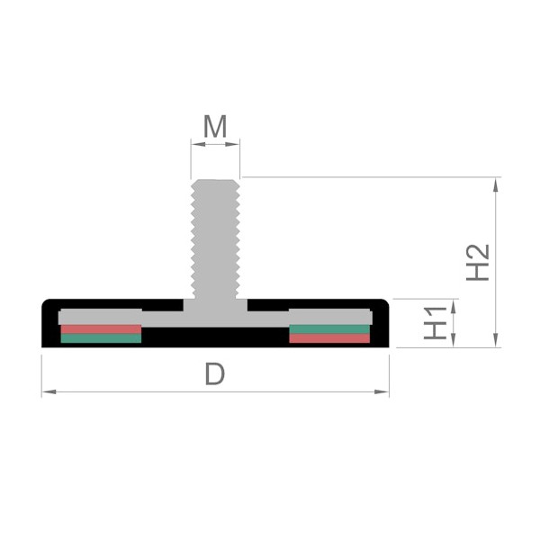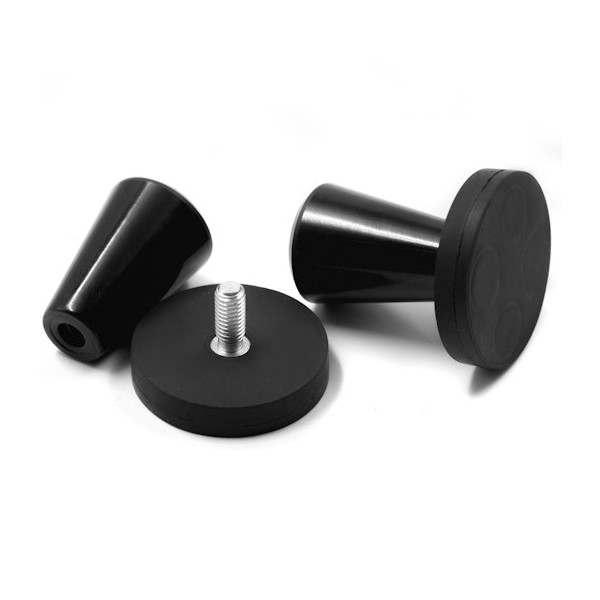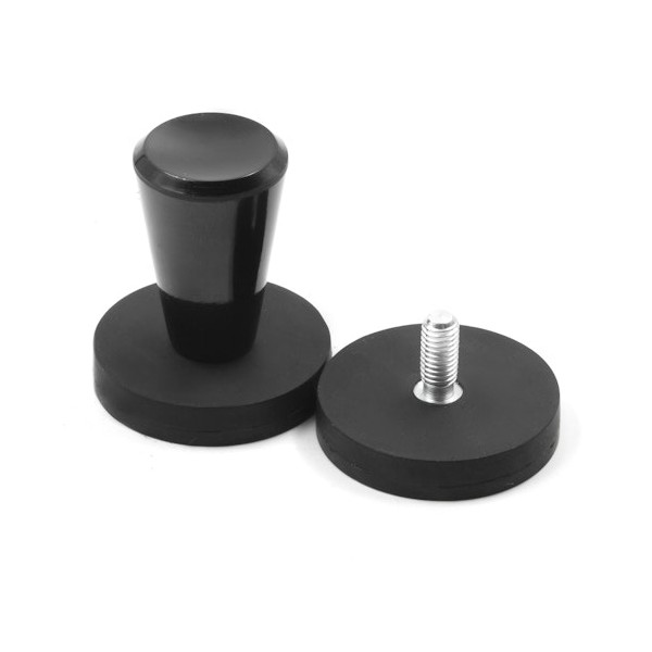 Estas bases magnéticas llevan un revestimiento de goma en el exterior, medida diámetro de 31 mm x 6 mm de altura y con vástago altura total 18 mm. Tiene un vástago roscado de métrica M5 para poder fijar a objetos que tengan rosca exterior. El recubrimiento de goma de esta base magnética sirve para proteger las zonas de arañazos y para su impermeabilidad. Imán en recipiente con fuerza de sujeción de 8 kg. aproximadamente. Magnetizado en N42 axial. Temperatura máxima de servicio de 80º C. La pieza tiene un peso de 21 gramos.