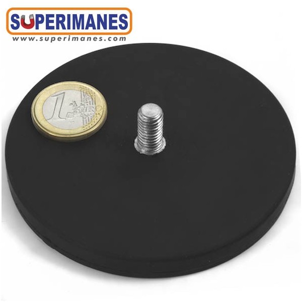 Estas bases magnéticas llevan un revestimiento de goma en el exterior, medida diámetro de 88 mm x 8,5 mm de altura y con vástago altura total 23,5 mm. Tiene un vástago roscado de métrica M8 para poder fijar a objetos que tengan rosca exterior. El recubrimiento de goma de esta base magnética sirve para proteger las zonas de arañazos y para su impermeabilidad. Imán en recipiente con fuerza de sujeción de 43 kg. aproximadamente. Magnetizado en N38 axial. Temperatura máxima de servicio de 80º C. La pieza tiene un peso de 190 gramos.