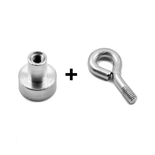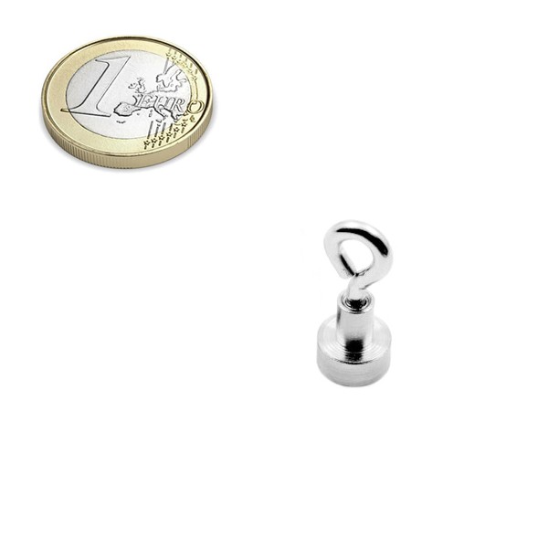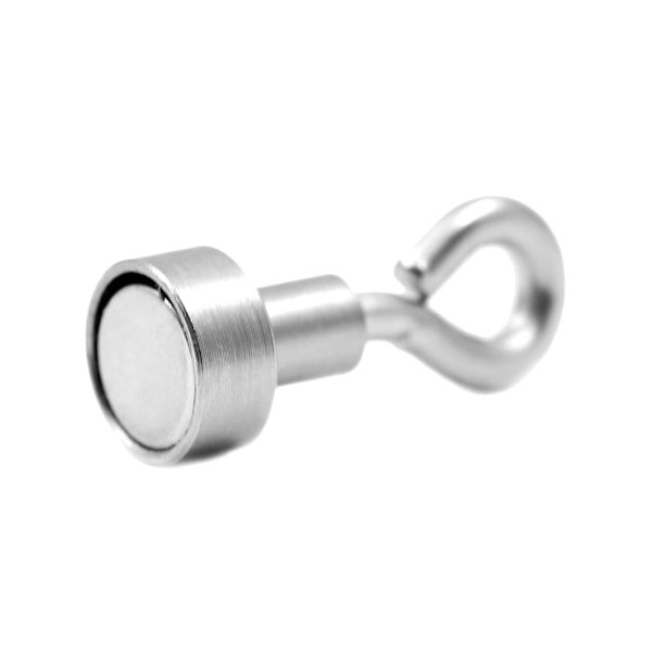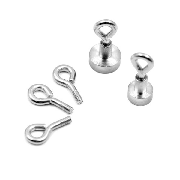 Estos imanes con hembrillas son niquelados. Tienen un diámetro de 10 mm. Fuerza sujeción 3 kilos aproximadamente. El gancho es cerrado tipo hembrilla y se puede desenroscar completamente, con métrica 3. Ideal para colgar objetos y que no se salgan. Son de neodimio y tienen un recubrimiento en níquel. Magnetización N38. Tiene un peso de 5,1 gramos.