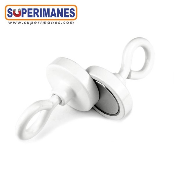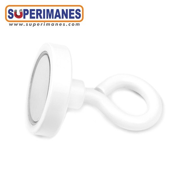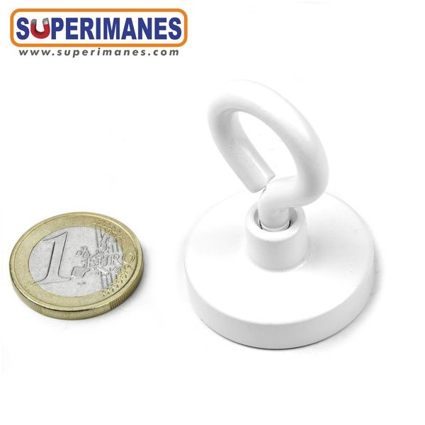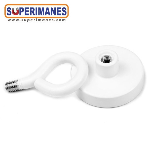 Estos imanes con hembrillas son blancos. Tienen un diámetro de 32,3 mm y un largo total con el gancho de 45,3 mm. Fuerza sujeción 28 kilos aproximadamente. El gancho es cerrado tipo hembrilla y se puede desenroscar completamente, con métrica 4. Ideal para colgar objetos y que no se salgan. Son de neodimio y tienen un recubrimiento en níquel. Magnetización N38. Tiene un peso de 56 gramos.