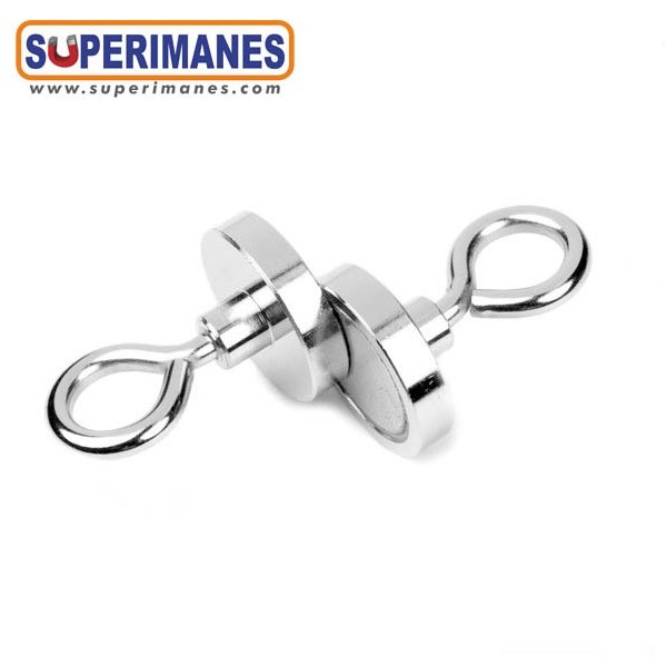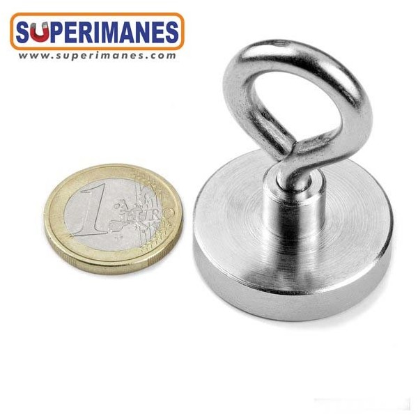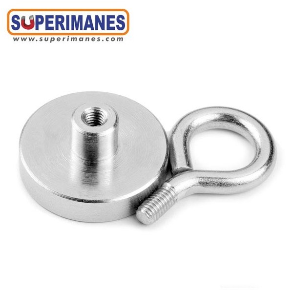 Estos imanes con hembrillas son niquelados. Tienen un diámetro de 32 mm. Fuerza sujeción 30 kilos aproximadamente. El gancho es cerrado tipo hembrilla y se puede desenroscar completamente, métrica 5. Ideal para colgar objetos y que no se salgan. Son de neodimio y tienen un recubrimiento en níquel. Magnetización N38. Tiene un peso de 53 gramos.