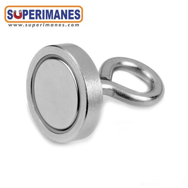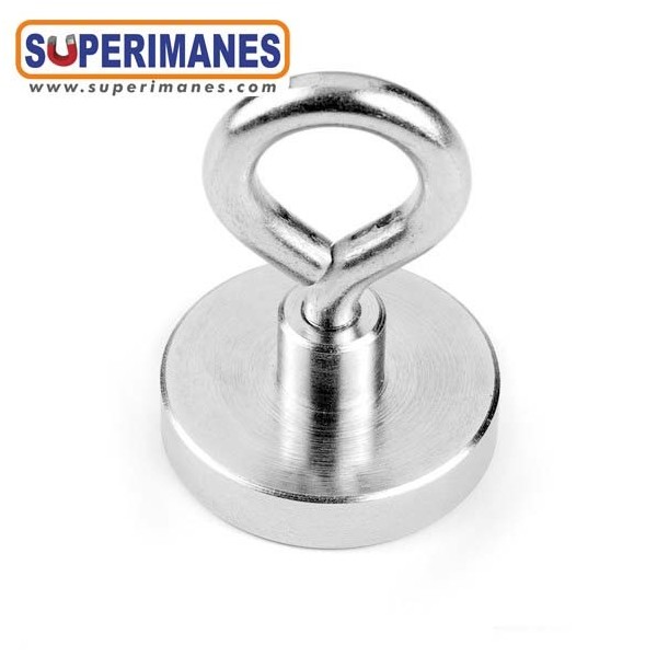 Estos imanes con hembrillas son niquelados. Tienen un diámetro de 32 mm. Fuerza sujeción 34 kilos aproximadamente. El gancho es cerrado tipo hembrilla y se puede desenroscar completamente, métrica 6. Ideal para colgar objetos y que no se salgan. Son de neodimio y tienen un recubrimiento en níquel. Magnetización N38. Tiene un peso de 53 gramos.