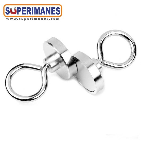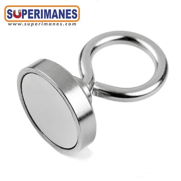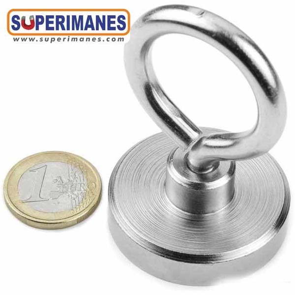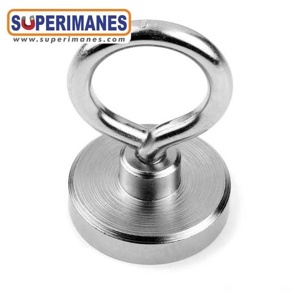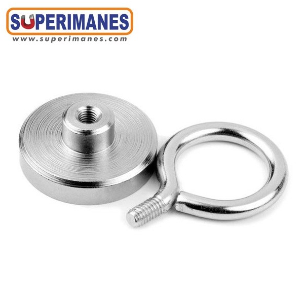 Estos imanes con hembrillas son niquelados. Tienen un diámetro de 40 mm. Fuerza sujeción 55 kilos aproximadamente. El gancho es cerrado tipo hembrilla y se puede desenroscar completamente, métrica 6. Ideal para colgar objetos y que no se salgan. Son de neodimio y tienen un recubrimiento en níquel. Magnetización N38. Tiene un peso de 110 gramos.