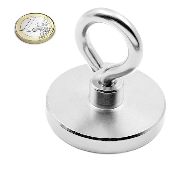 Este imán de neodimio en recipiente de acero lleva como complemento una hembrilla o anilla de elevación, métrica 8 zincada galvanizada. Diámetro 60 mm y altura de recipiente 15 mm siendo la altura total con la argolla son 59 mm. Base magnética con fuerza de sujeción de 110 kg. aproximadamente. Magnetizado en N38 axial. Imán con revestimiento de níquel. Temperatura máxima de servicio de 80º C. La pieza tiene un peso de 290 gramos.