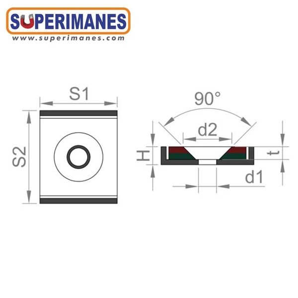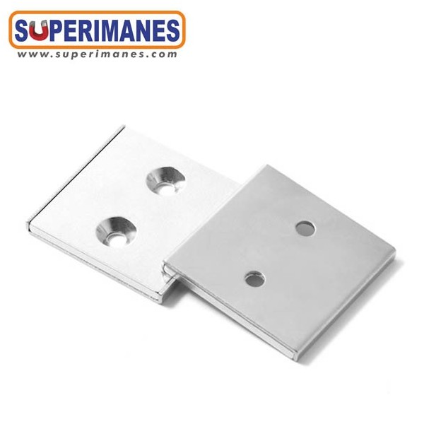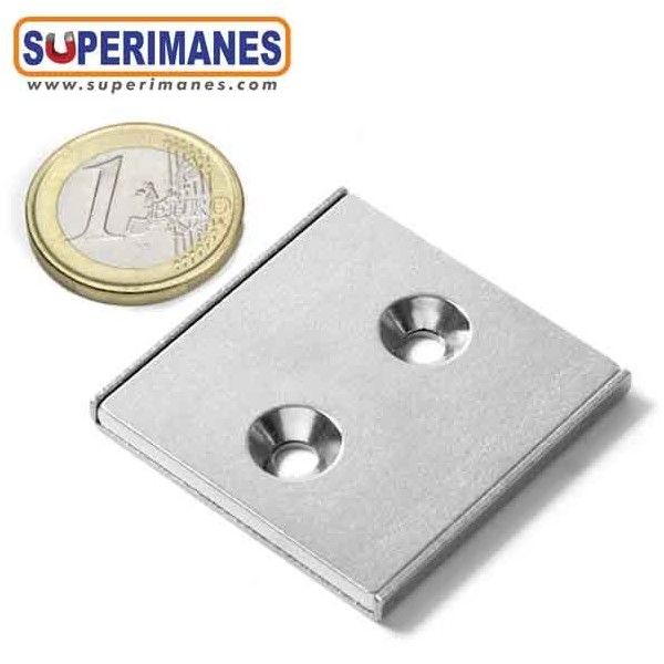 Imán de neodimio en forma de barra plana para atornillar. El imán está embutido en un perfíl de acero cuadrado en forma de U, lleva dos taladros avellanados para poder atornillarlo. Tiene una medida de 40x40 mm y una altura de 4mm. Para usar con tornillos de cabeza avellanada. Bloque magnético cuadrado con fuerza de sujeción de 25 kg. aproximadamente. Magnetizado en N38 axial. Con revestimiento de níquel. Temperatura máxima de servicio de 80º C. La pieza tiene un peso de 44 gramos.