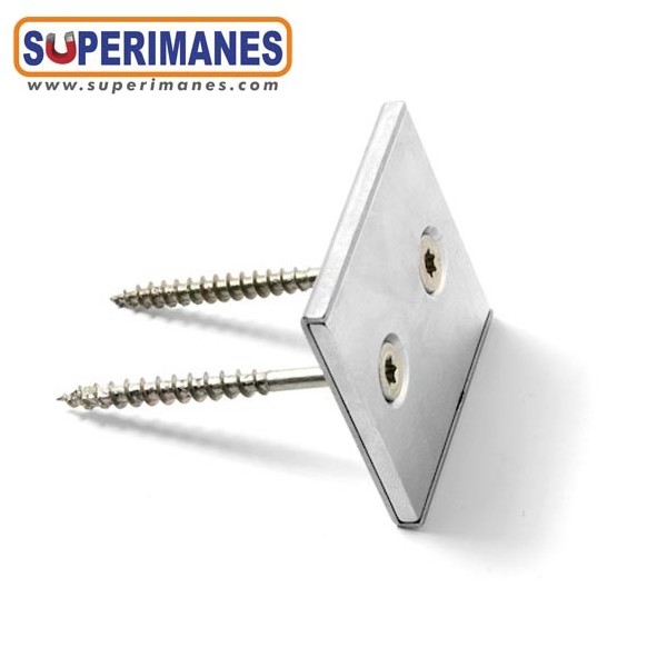 El acero hace que sea el imán más resistente a los golpes, además, de darle mucha más fuerza al imán en un contacto directo. Imán para atornillar en lugares donde no hay metal y no tienes posibilidad de usar su campo magnético. Estos tipos de imanes son muy usados en carpinterias, ferias, comercios, muebles, cerramientos de puertas, cocinas, etc.