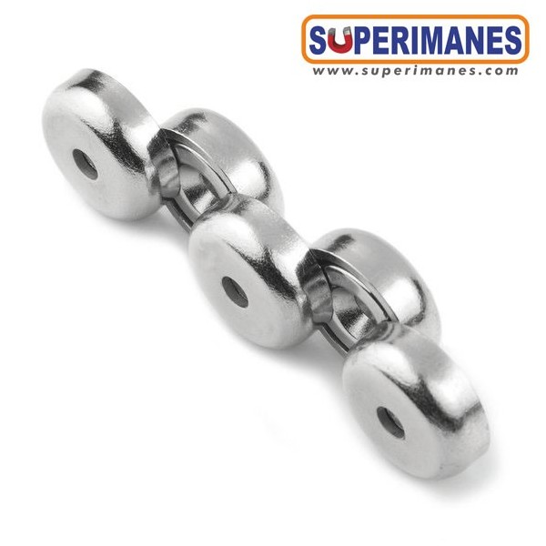 Principio: Los potentes imanes de neodimio van introducidos en un recipiente de acero, esto hace que el campo magnético esté dirigido hacia abajo. El recipiente de acero aumenta la fuerza de sujeción del imán cuando este está en contacto directo con una superficie gruesa de hierro. Si no hay contacto directo con la pieza contraria o si la chapa de hierro es delgada, tosca o está pintada, la carga que se le puede aplicar al imán será mucho menor.
