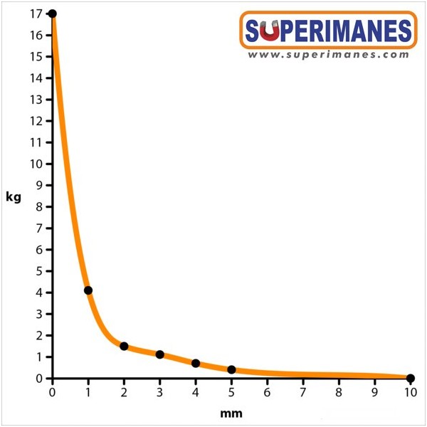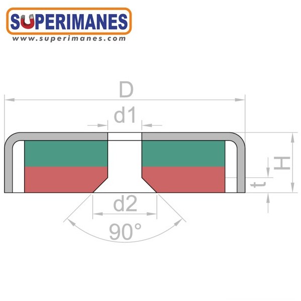 Principio: Los potentes imanes de neodimio van introducidos en un recipiente de acero, esto hace que el campo magnético esté dirigido hacia abajo. El recipiente de acero aumenta la fuerza de sujeción del imán cuando este está en contacto directo con una superficie gruesa de hierro. Si no hay contacto directo con la pieza contraria o si la chapa de hierro es delgada, tosca o está pintada, la carga que se le puede aplicar al imán será mucho menor.