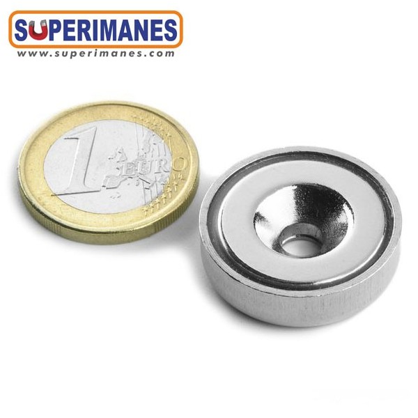 Imanes de neodimio en recipiente con taladros avellanados para atornillar. Base magnética con forma redonda de diámetro 25 mm y altura 7 mm. Discos magnéticos de neodimio para atornillar. Tienen fuerza de sujeción de 19 kilogramos aproximadamente. Imán redondo muy potente. Magnetizado en 38SH axial. Imán embutido en un recipiente metálico con revestimiento de níquel. Temperatura máxima de servicio de 150º C. La pieza tiene un peso de 20 g.
