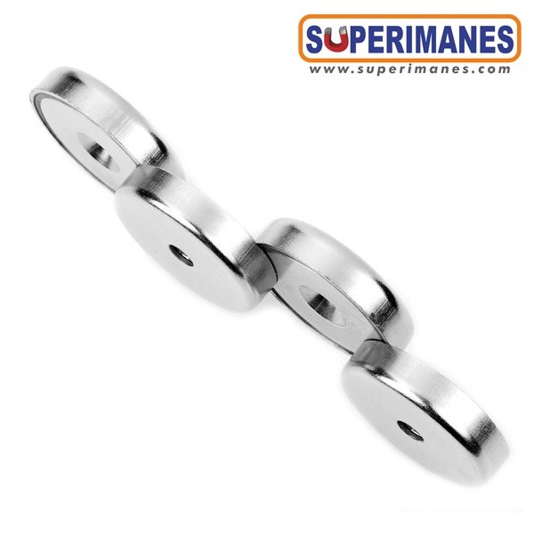Imanes de neodimio en recipiente con taladros avellanados para atornillar. Base magnética con forma redonda de diámetro 32 mm y altura 7 mm. Discos magnéticos de neodimio para atornillar. Tienen fuerza de sujeción de 30 kilogramos aproximadamente. Imán redondo muy potente. Magnetizado en N38 axial. Imán embutido en un recipiente metálico con revestimiento de níquel. Temperatura máxima de servicio de 80º C. La pieza tiene un peso de 35 g.
