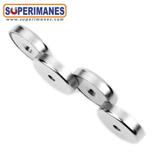 Imanes de neodimio en recipiente con taladros avellanados para atornillar. Base magnética con forma redonda de diámetro 32 mm y altura 7 mm. Discos magnéticos de neodimio para atornillar. Tienen fuerza de sujeción de 30 kilogramos aproximadamente. Imán redondo muy potente. Magnetizado en 38SH axial. Imán embutido en un recipiente metálico con revestimiento de níquel. Temperatura máxima de servicio de 150º C. La pieza tiene un peso de 35 g.