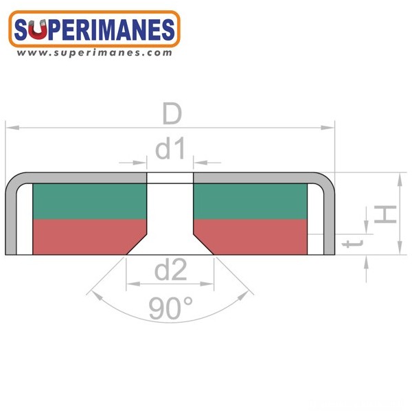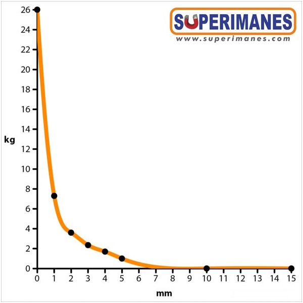 Principio: Los potentes imanes de neodimio van introducidos en un recipiente de acero, esto hace que el campo magnético esté dirigido hacia abajo. El recipiente de acero aumenta la fuerza de sujeción del imán cuando este está en contacto directo con una superficie gruesa de hierro. Si no hay contacto directo con la pieza contraria o si la chapa de hierro es delgada, tosca o está pintada, la carga que se le puede aplicar al imán será mucho menor.
