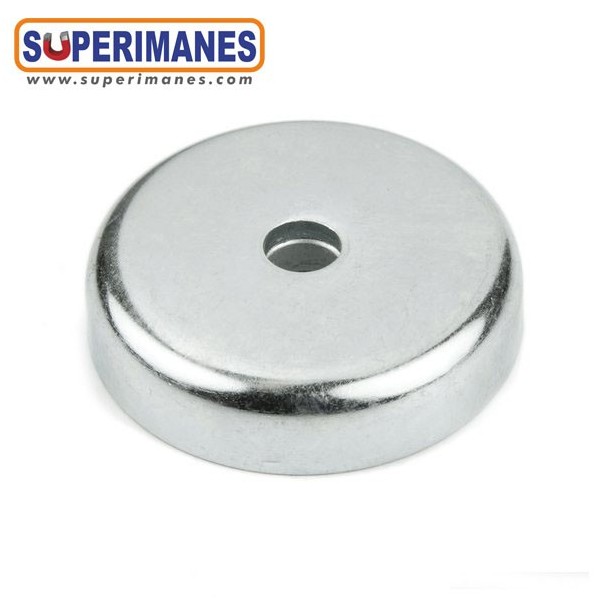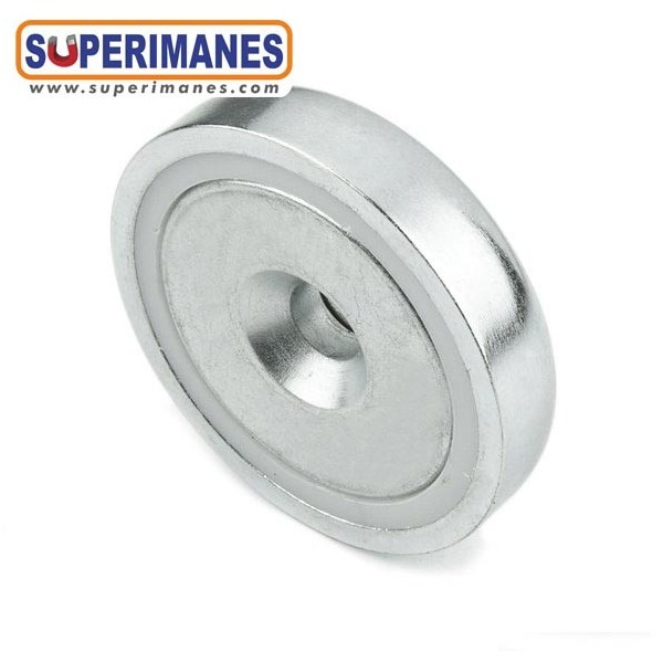 Imanes de neodimio en recipiente con taladros avellanados para atornillar. Base magnética con forma redonda de diámetro 50 mm y altura 10 mm. Discos magnéticos de neodimio para atornillar. Tienen fuerza de sujeción de 90 kilogramos aproximadamente. Imán redondo muy potente. Magnetizado en N42 axial. Imán embutido en un recipiente metálico con revestimiento de níquel. Temperatura máxima de servicio de 80º C. La pieza tiene un peso de 140 g.