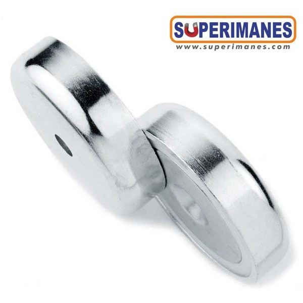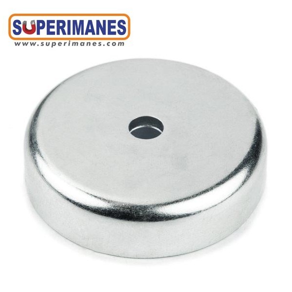 Imanes de neodimio en recipiente con taladros avellanados para atornillar. Base magnética con forma redonda de diámetro 60 mm y altura 15 mm. Discos magnéticos de neodimio para atornillar. Tienen fuerza de sujeción de 130 kilogramos aproximadamente. Imán redondo muy potente. Magnetizado en N42 axial. Imán embutido en un recipiente metálico con revestimiento de níquel. Temperatura máxima de servicio de 80º C. La pieza tiene un peso de 250 g.