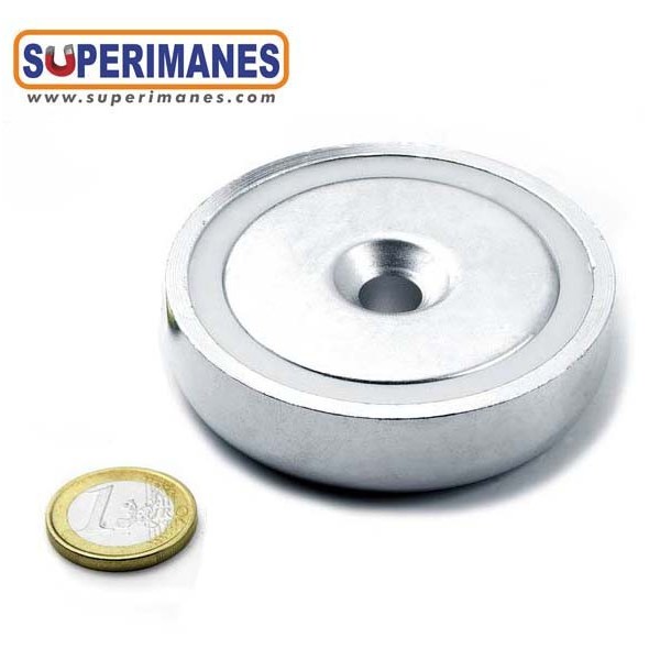 Imanes de neodimio en recipiente con taladros avellanados para atornillar. Base magnética con forma redonda de diámetro 75 mm y altura 15 mm. Discos magnéticos de neodimio para atornillar. Tienen fuerza de sujeción de 155 kilogramos aproximadamente. Imán redondo muy potente. Magnetizado en N42 axial. Imán embutido en un recipiente metálico con revestimiento de níquel. Temperatura máxima de servicio de 80º C. La pieza tiene un peso de 320 g.