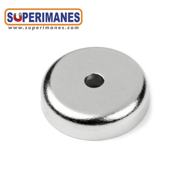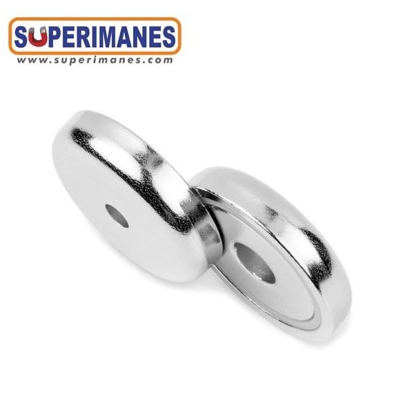Imanes de neodimio en recipiente con taladros cilíndricos para atornillar. Base magnética con forma redonda de diámetro 32 mm y altura 8 mm. Discos magnéticos de neodimio para atornillar con tornillos sin cabeza avellanada. Tienen fuerza de sujeción de 23 kilogramos aproximadamente. Imán redondo muy potente. Magnetizado en N38 axial. Imán embutido en un recipiente metálico con revestimiento de níquel. Temperatura máxima de servicio de 80º C. La pieza tiene un peso de 36 g.