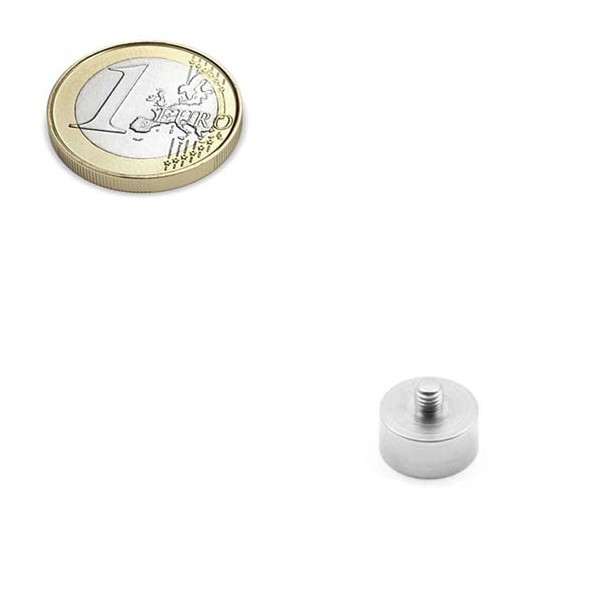 Bases magnéticas con vástago roscado, niquelados. Tienen un diámetro de 10 mm y un largo total con él vástago de 8 mm. Fuerza sujeción 2,5 kilos aproximadamente. Vástago macho con métrica 3. Ideal para colocar a objetos con rosca hembra o tuercas. Son de neodimio y tienen un recubrimiento en níquel. Magnetización N42. Tiene un peso de 3,6 gramos.