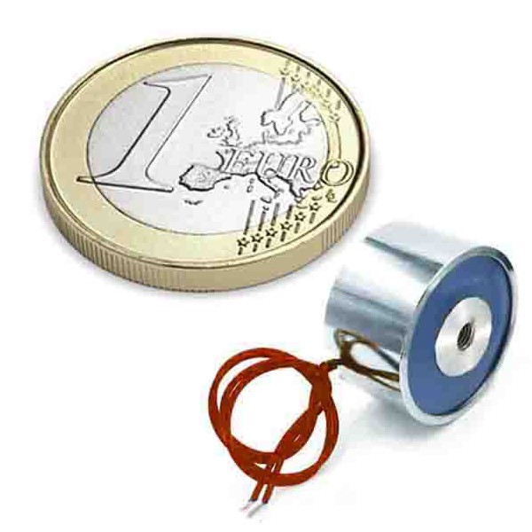 Electroimán circular pequeño con gran fuerza de retención y consumo de corriente moderado. Esta ventosa electromagnética circular tiene un diámetro de 20 mm y altura de 15 mm. Estos electroimanes generan su magnetismo y atracción cuando recibe corriente eléctrica, liberando el objeto al desconectar de la corriente.