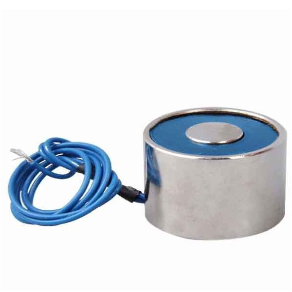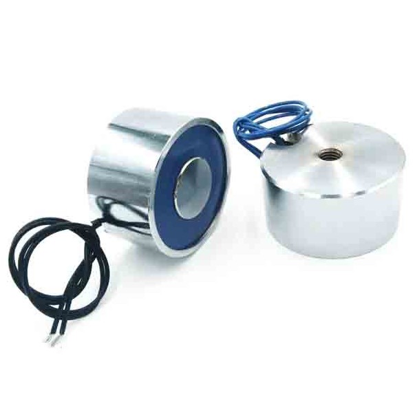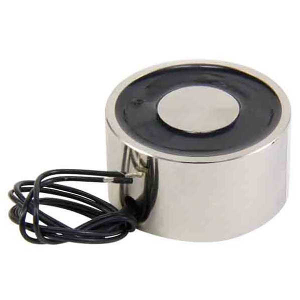 Electroimán circular pequeño con gran fuerza de retención y consumo de corriente moderado. Esta ventosa electromagnética circular tiene un diámetro de 50mm y altura de 43mm. Estos electroimanes generan su magnetismo y atracción cuando recibe corriente eléctrica, liberando el objeto al desconectar de la corriente.
