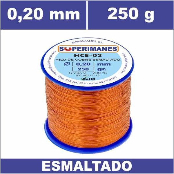Alambres de cobre esmaltados en 0.20 mm carrete 250 gramos. Clase 200º Grado 2. Rollos de hilos de cobre de gran calidad. También disponibles en otros carretes. Consultar estos cables de cobre para otros pesos.