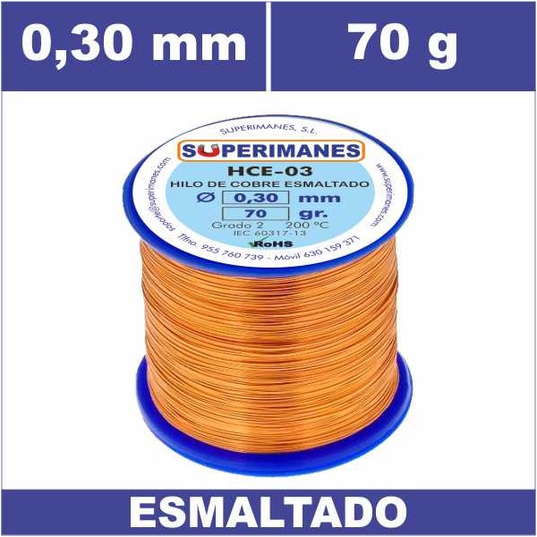 Alambres de cobre esmaltados en 0.30 mm carrete 70 gramos. Clase 200º Grado 2. Rollos de hilos de cobre de gran calidad. También disponibles en otros carretes. Consultar estos cables de cobre para otros pesos.