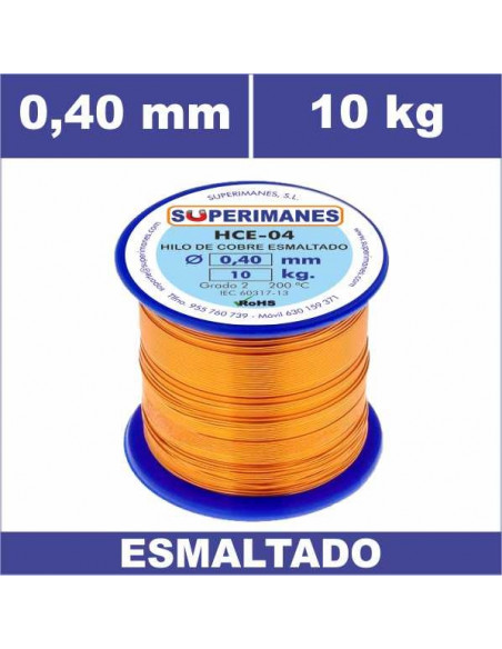 Alambres de cobre esmaltados en 0.40 mm carrete 10 kilogramos. Clase 200º Grado 2. Rollos de hilos de cobre soldables de gran calidad. También disponibles en otros carretes. Consultar estos cables de cobre para otros pesos.