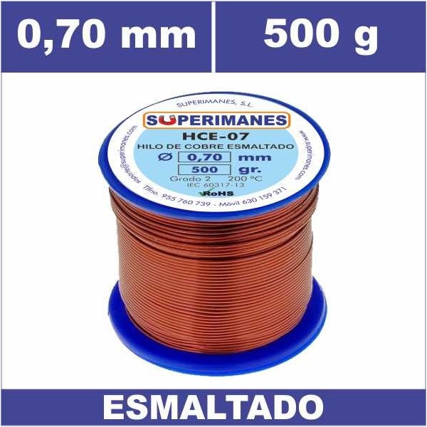 Alambres de cobre esmaltados en 0.70 mm carrete 500 gramos. Clase 200º Grado 2. Rollos de hilos de cobre de gran calidad. También disponibles en otros carretes. Consultar estos cables de cobre para otros pesos.